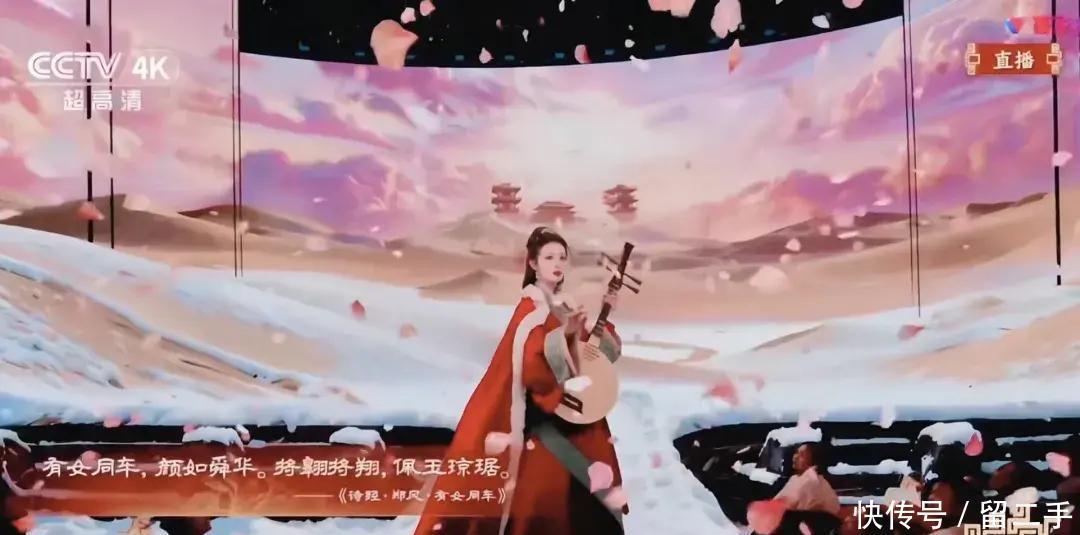 再看王楚然,那叫一个“飒美杀”代表。在舞台上,她以王昭君的形象出镜。那一幕真敢说是称得上经典。漫天飞花中,她静静站立,风吹拂一袭青衣,手抚琵琶,目光深远且冷静。每个动作都是戏,大气又有力量感。后来,她轻轻抬手拨动琴弦,琴声响起,漫天花落,镜头一秒“封神”,直接把观众送进了意境。网友戏称,这哪是舞台,这是“史诗般的绝美定格画面”。有人更直接,“王楚然绝对是古装脸天花板,春晚镜头真会拍!”更有粉丝戏言:“春晚挖的宝,万物皆有昭君脸。”