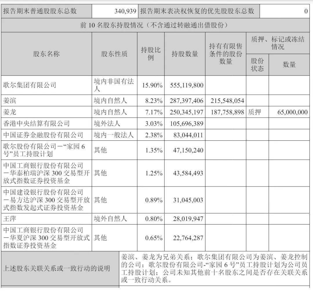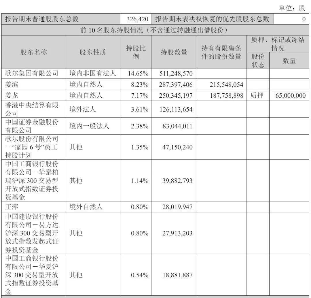 截至2025年6月30日,歌尔集团有限公司持股15.9%,姜滨持股8.23%,姜龙持股为7.17%,香港中央结算有限公司持股为3.03%,中国证券金融股份有限公司持股为2.38%;