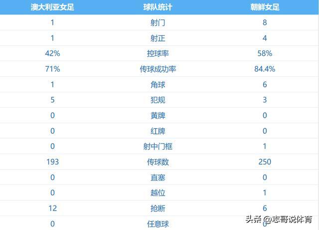 从上半场来看,朝鲜队其实是占据着场面上的优势,控球率达到了58%,射门8-1、射正4-1均领先澳大利亚队,不过取得领先的却是澳大利亚队。