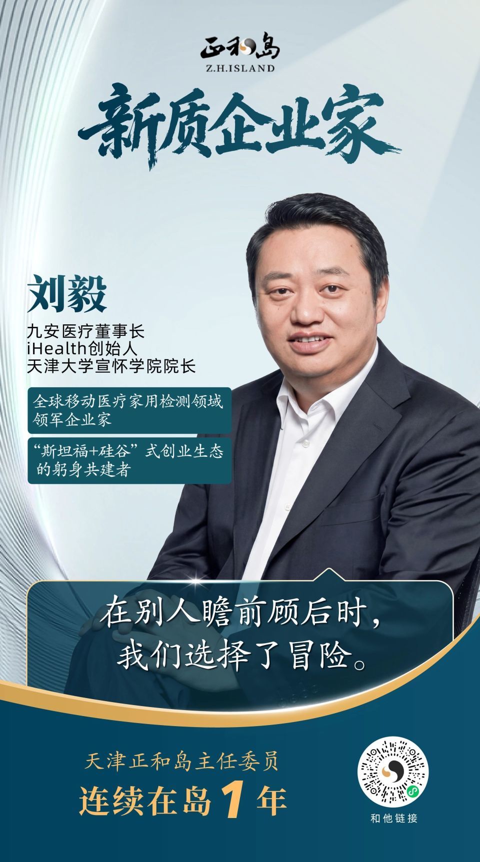 朋友们好,今天要认识的这位岛邻,是刘毅——九安医疗董事长、iHealth创始人、天津大学宣怀学院院长,也是咱们天津正和岛的主任委员。