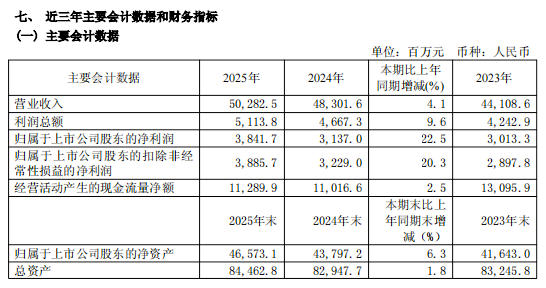3月24日披露的年报显示,该公司2025年度实现总营业收入502.82亿元,同比增长4.1%;实现净利润38.42亿元,同比增长22.5%,毛利率为17.39%(同比提升1.7个百分点),净利率为8.07%(同比提升1.03个百分点)。